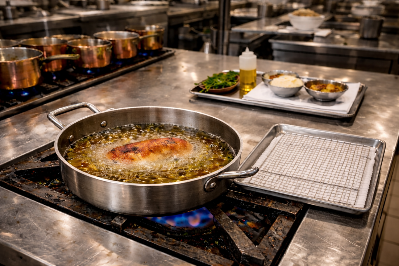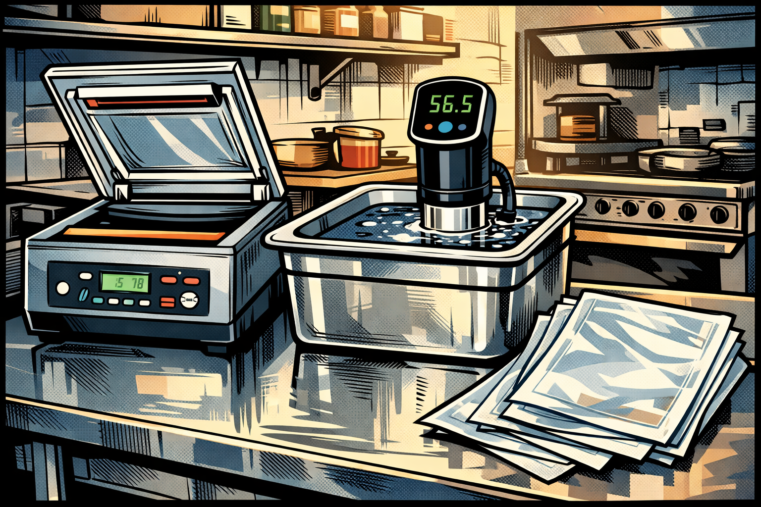 Estudiaron un poco de biología y descubrieron que lo que había que mantener dentro del producto era el colágeno y que para que esto sucediera los pescados no podían pasar de 55ºC. También aprendieron que las fibras musculares tenían unas membranas celulares que mantenían el colágeno dentro de las células, pero al racionar los diferentes productos parte de ese colágeno se perdía en la deshidratación del marcado en la plancha. Y además se crea una costra seca. Entonces pensaron ¿Cómo podemos proporcionarle una membrana a los alimentos para intentar que pierdan el mínimo colágeno posible? Envasándolo al vacío. ¿Y cómo conseguimos que la temperatura llegue al centro del producto uniformemente? Sumergiéndolo en un líquido. Entonces tenían que tener un líquido con una temperatura constante pero sin tener que estar controlándolo continuamente. Y utilizaron una freidora que no usaban. Ahi se dieron cuenta de que si metían una ración de pescado de 180 gr a 65ºC tardaba entre 8 y 10 minutos en alcanzar 55ºC en el centro. Pero claro, el pescado estaba soseras porque no había reacción de Maillard. Entonces sacaban el pescado del líquido, abrían la bolsa de vacío, secaban el pescado con un papel y lo marcaban por la piel. Al tener el máximo de colágeno posible al marcarlo en la plancha se hace una costra fina, crujiente y delicada. Pensaron que en los laboratorios de farmacia debía de haber algún tipo de maquinaria para mantener un líquido a temperatura constante y además que mantuviera el agua en movimiento. Efectivamente lo había. Es lo que después comercializaría ICC con la marca Roner, doblando el precio real del aparato de farmacia.