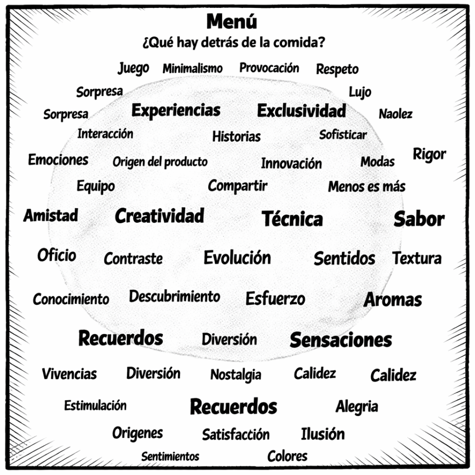 Puntualidad, limpieza, rapidez, resiliencia, curiosidad, compañerismo, perfección. Productos, texturas, temperaturas. Mar, tierra y aire. Técnicas, maquinaria, medios, personal. Colores, estructuras, estabilidad y sabor. Aire, nube, esponja, espuma. Esferificación, gelificación, merengue seco, impregnación. Baja temperatura, nitrógeno líquido y un 55/5. Influencias Chinas, Japonesas, Vietnamitas, Mejicanas y Peruanas. Tailandesa, Argentina, Francesa e Italiana. Turcas, Griegas, Libanesas y Marroquíes.
